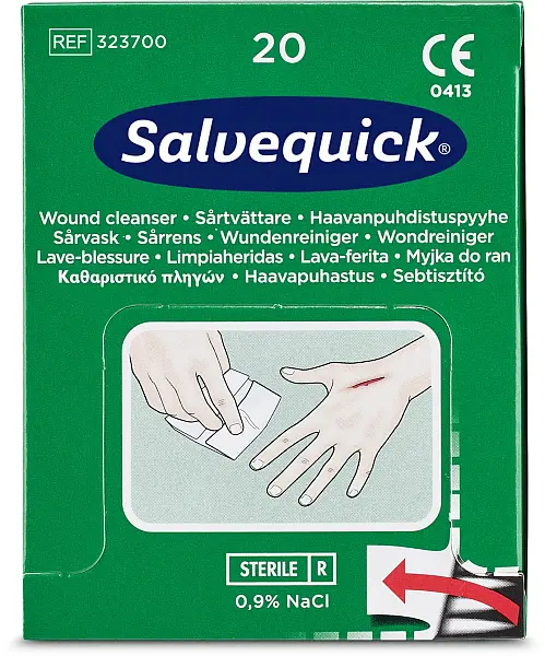 A doboz 20 db külön csomagolt, karcolások, vágások által keletkezett sebek tisztítására alkalmas törlőkendőt tartalmaz. A Salvequick sebtisztító kendőnek köszönhetően nincs szükség vattára és fertőtlenítőszeres flakonokra. Steril fiziológiás sóoldattal átitva, egyenként csomagolva. Cederroth elsősegély-állomás utántöltéséhez is alkalmas. A kendők mérete 100 x 140 mm. IIa osztályú orvostechnikai eszköz.