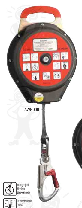 CADO-W6 (AWR006): 6 m hosszú, 20 mm széles poliészter-kevlár hevederszalag, műanyag házban, karabinerrel (4,7 kg) Cikkszám: AWR-006 - a munkavégző mozgásának megfelelően a zuhanásgátló rugós tartódobja automatikusan le- illetve feltekerve a kötélzetet, állandóan feszesen tartja azt - 135 kg maximális terhelés, rövid fékezőtávolság, legfeljebb 6 kN fékezőerő - acél felfüggesztési pont és alsó gyűrű, visszacsapódást gátló műanyag gömb - könnyen kezelhető alumínium-acél karabiner dupla rugós biztonsági zárral (220g)