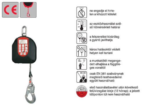 - a munkavégző mozgásának megfelelően a zuhanásgátló rugós tartódobja automatikusan le- illetve feltekerve a kötélzetet, állandóan feszesen tartja azt
