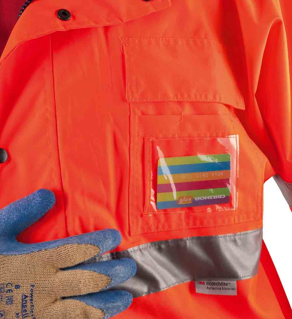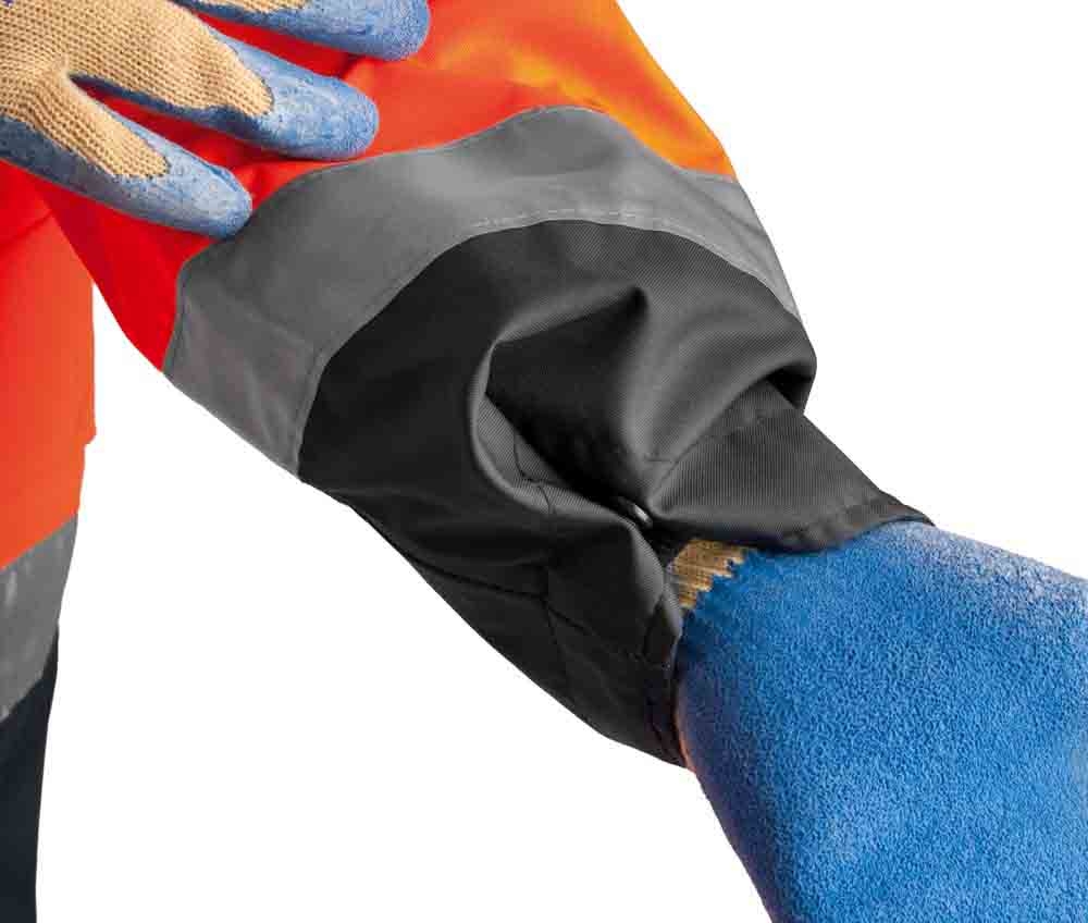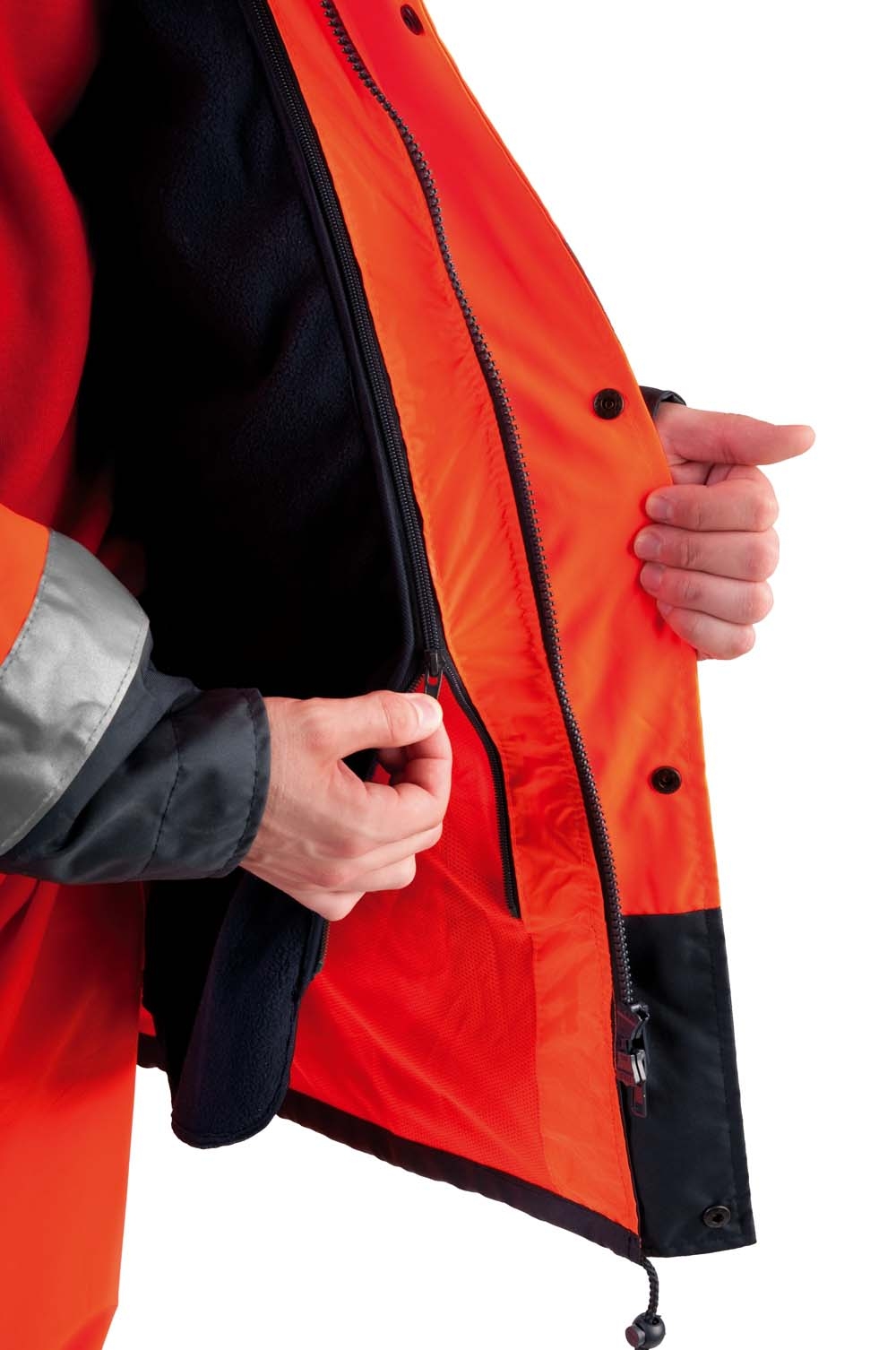 - Bélelt, vízhatlan jólláthatósági dzseki az EN 471 szabványnak megfelelő láthatósággal,